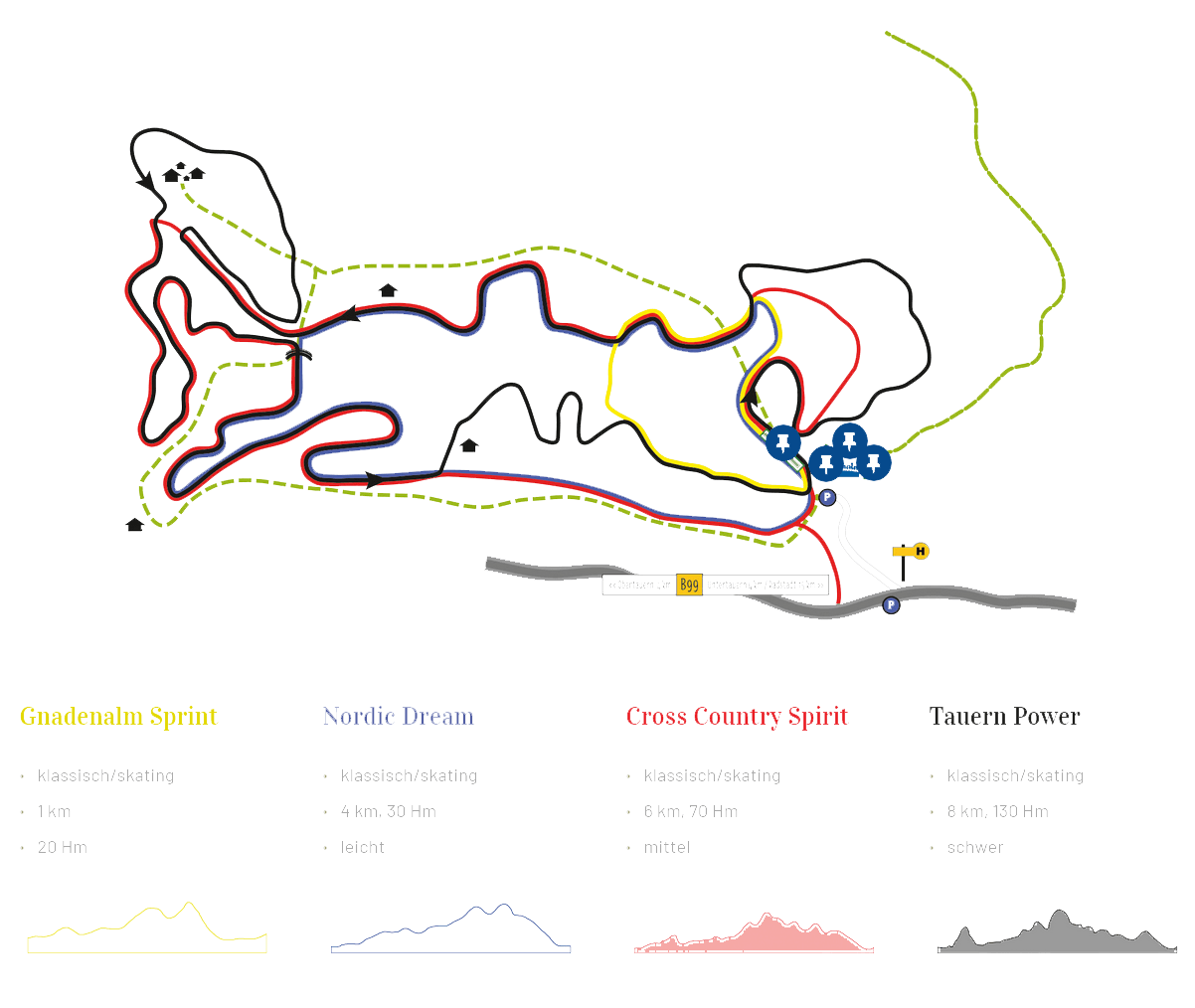 Die längste Loipe verbindet die Orte Tweng und Mauterndorf. Die Einstiegsstellen: Franzenbauer in der Twenger Ortsmitte, beim Holzlagerplatz im Twenger Lantschfeld, gegenüber des Purnbauern in Vordertweng und bei der Haltestelle Maly.